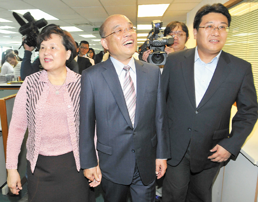 苏贞昌(中)上午到民进党党部完成党主席选举登记。来源:台湾《联合晚报》