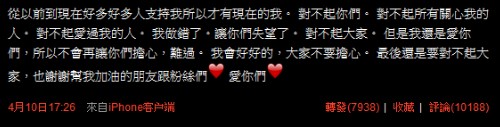 据报道,Makiyo昨天在微博上写下“从以前到现在好多好多人支持我所以才有现在的我,对不起你们,对不起所有关心我的人,对不起爱过我的人,我做错了,让你们失望了,对不起大家”,表达出自己的歉意。对于Makiyo在微博的道歉文,有不少网友指出,虽然接受她的道歉,但还是认为她该退出演艺圈,不要再待在台湾。
