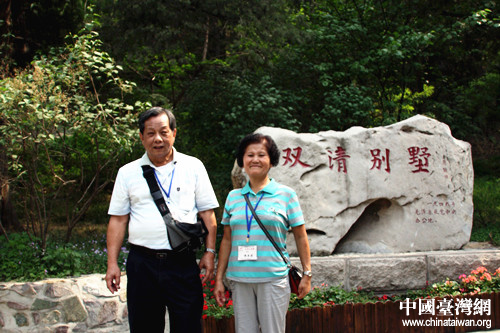 一对老夫妻在“双清别墅”前合影留念。(中国台湾网 刘承思 摄)