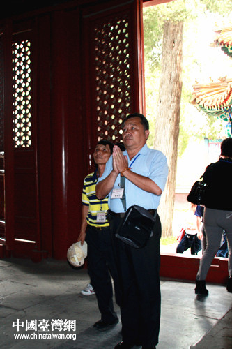 团员李先生正在向佛像礼拜。(中国台湾网 刘承思 摄)
