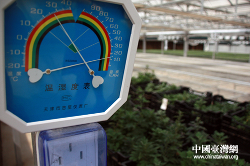 顺义国际鲜花港花卉生产温室中的温湿度表。(中国台湾网 罗旭婷 摄)