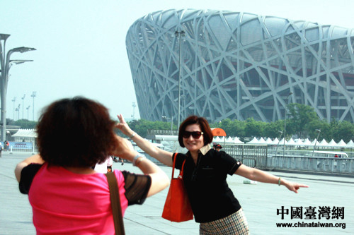 台湾参访团与鸟巢合影留念。(中国台湾网 刘承思 摄)