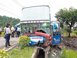宜兰梅花湖风景区发生重大车祸,游览车撞上民宅围墙(图)造成车内37人受伤,驾驶座挡风玻璃全部碎裂,司机首当其冲,双腿骨折受伤最严重。(图片来源:台湾《中国时报》)