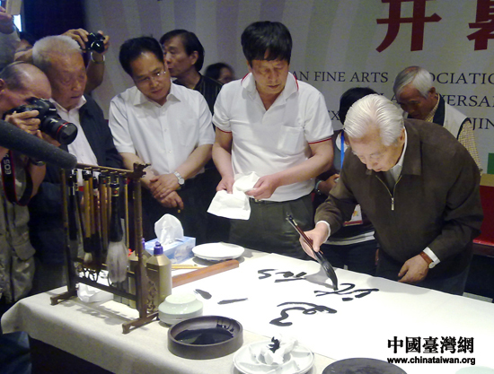 中国书法家协会顾问、台籍著名书法家刘艺现场挥毫“八仙过海”。(中国台湾网 王思羽 摄)