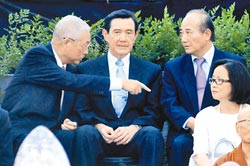 马英九(右)、吴敦义(左)与王金平(右)13日出席慈济浴佛典礼,3人在会中频频交谈,马英九表情始终严肃。(图片来源:台湾《中国时报》)