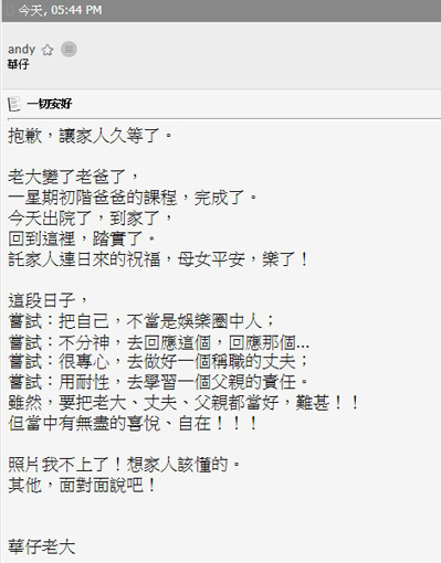 华仔说,“抱歉,让家人久等了”,“老大(华仔自称)变了老爸了”,文中感慨他已完成一星期初阶爸爸的课程,同时报告母女平安。华仔表示,这段日子他试着全心全意当个称职的丈夫,先不把自己当成一个艺人,虽然要把老大、丈夫、父亲都当好很难,但他坦言“当中有无尽的喜悦、自在”。