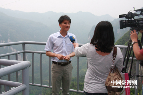矮寨特大悬索桥设计师张永健向台媒介绍大桥情况 (中国台湾网 张晓静 摄)