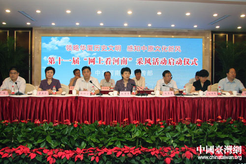 第十一届“网上看河南”采风活动在郑州启动,河南省委常委、宣传部部长赵素萍、河南省发展改革委员会主任张维宁、河南省广电局局长赵景春、河南省文化厅厅长杨丽萍等出席启动仪式。(中国台湾网 于斯文 摄)