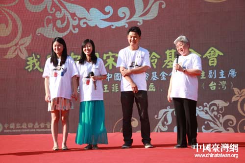 中国宋庆龄基金会副主席唐闻生(右)与《我们的心》词曲作者陈莉家、李正磊(中),志愿者王菲(左)在一起。(中国台湾网 孟雅诗 摄)