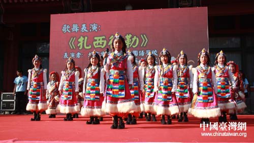 北京市海淀区外国语学校玉树藏族小朋友在演唱藏族歌曲《扎西德勒》。(中国台湾网 孟雅诗 摄)