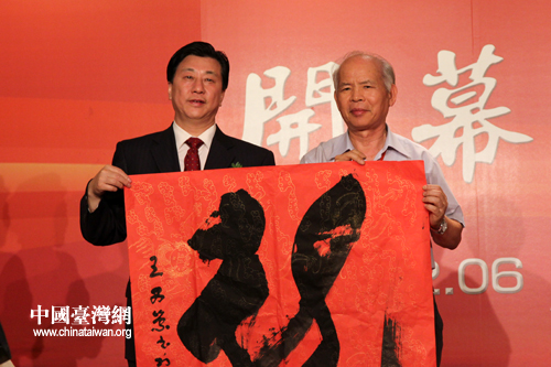 台湾书法家将一副“龙”字赠与梁滨。(中国台湾网 马迪 摄)