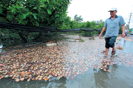 豪大雨造成屏东林边淹水不退,当地莲雾落果严重,农民欲哭无泪,担心连莲雾树株也将不保。图片来源:台湾《联合报》