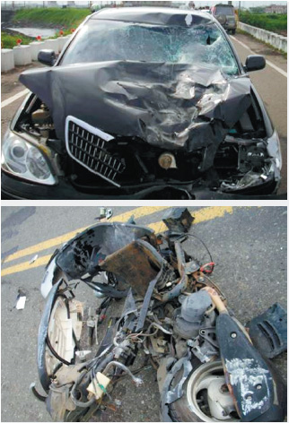 彰化县民酒驾撞上摩托车,引擎盖全毁。张东敏夫妇骑乘的摩托被撞到变形。