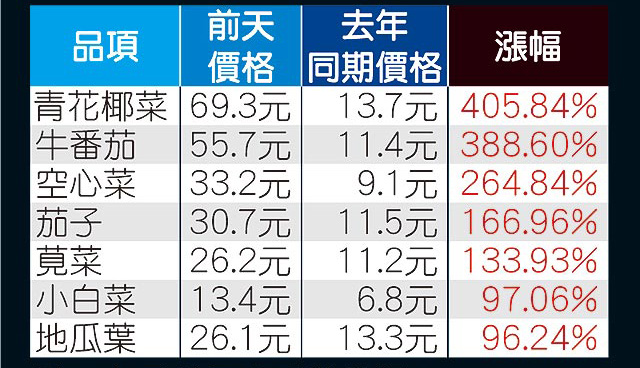 台北果菜市场前天整体蔬菜批发价每公斤26元,较去年同期17.4元涨近5成,其中青花椰菜每公斤69.3元、较去年同期涨4倍、空心菜涨2.6倍、小白菜、地瓜叶也涨了近1倍。