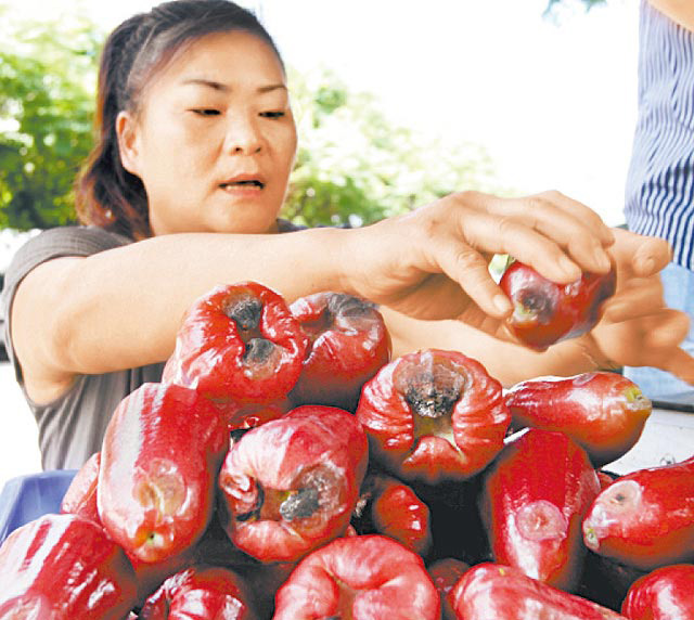 古坑乡农户钟妈妈昨指红宝石莲雾被大雨打烂。(图片来源:台湾媒体)