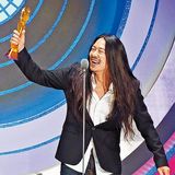乱弹阿翔一举夺下金曲奖最佳华语男歌手奖,在台上高举奖座致谢。图片来自台媒