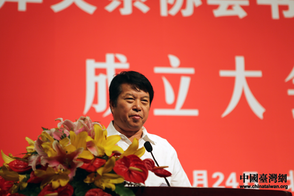 6月24日上午,海峡两岸关系协会书画交流分会成立大会在北京钓鱼台国宾馆举行。图为中国文联党组副书记、驻会副主席覃志刚在成立大会上致贺词。(中国台湾网 于斯文 摄)