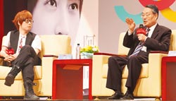 阿信(左)与施振荣谈幸福,并分享如何从工作岗位获得幸福的感觉。图片来源:台湾《中国时报》