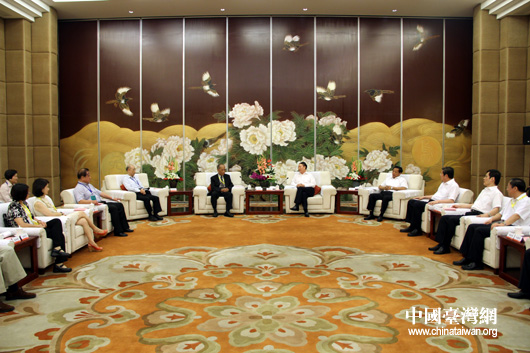 文化部杨志今副部长、山东省委常委颜世元、山东省副省长张建国7月2日晚会见了“情系齐鲁——两岸文化联谊会”的台湾嘉宾团长林圣芬一行。(中国台湾网 芮益芳 摄)