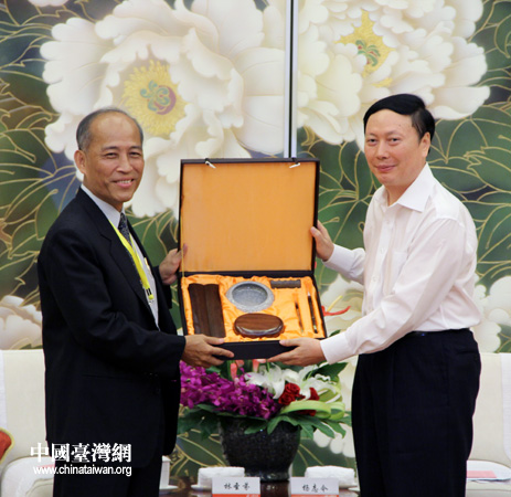 文化部副部长、中华文化联谊会顾问杨志今向参加“情系齐鲁”活动的台湾嘉宾团团长林圣芬赠送特色礼品。(中国台湾网 芮益芳 摄)