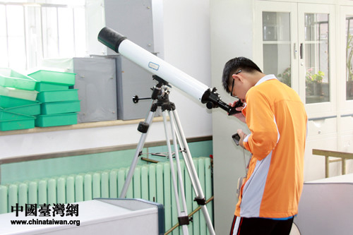 来自台湾的初中生正在使用教室后方的望远镜。(中国台湾网 刘承思 摄)