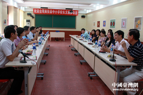 台湾教育工作者正与西什库小学校长阮平先生进行交流讨论。(中国台湾网 刘承思 摄)