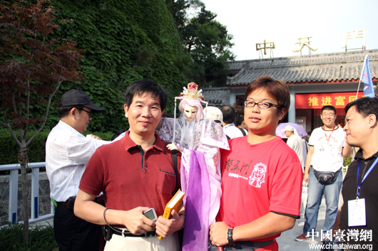 台中声五洲掌中剧团团长王英峻(图右)带着他的布袋戏主角游览泰山,“我的男主角也登山泰山啦!”(中国台湾网 芮益芳 摄) 第1页第2页第3页第4页