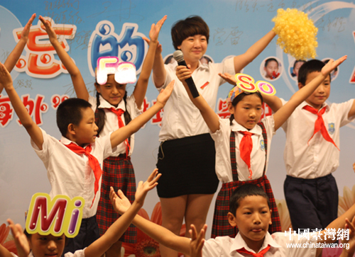 2012年7月5日,北京市海淀外国语实验学校举办了题为《难忘的海外生活》的主题班会,22名来自青海省玉树地震灾区的孩子展现了他们两年来学习、生活中珍贵难忘的经历与回忆。图为英语课堂再现,孩子们熟练地用英语对话和歌唱。(中国台湾网 杨永青 摄)