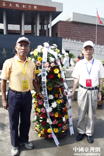 台湾嘉宾团团长、“中国电视公司”董事长林圣芬(左)和荣誉团长中华两岸经贸投资文化教育协会理事长、前台湾“陆委会”主任委员张京育向先烈献上鲜花。(中国台湾网 芮益芳 摄)
