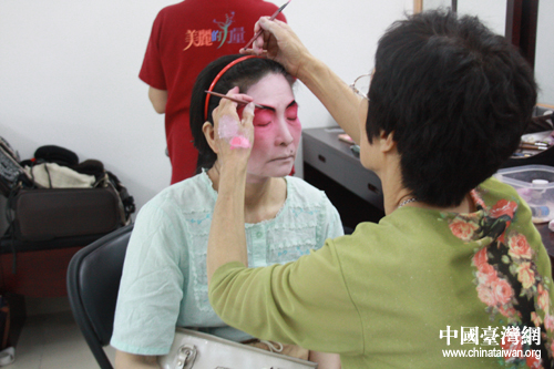 台湾师范大学昆曲研究社、中华昆曲艺术协进会常务理事蔡孟珍女士在后台上妆。(中国台湾网 孟雅诗 摄)