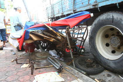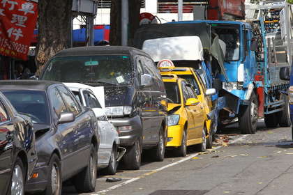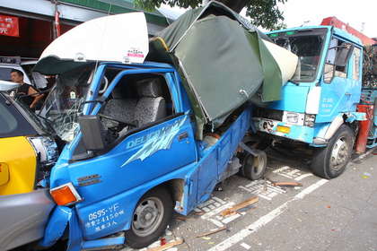 中国台湾网7月11日消息 据台湾媒体报道,今天上午7点15分,正处上班高峰期,台中市1辆大货车驾驶赖某载运大型电器设备,行经台中市自由路与复兴路口处疑剎车失灵不慎追撞2辆小货车后,失控冲撞路边停车,把7辆车推挤成一团。事故原因警方正在调查中。(中国台湾网 焦源源)