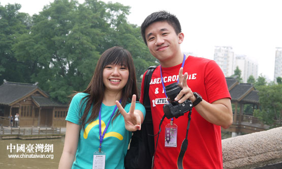 台湾成功大学的刘韦亿(男)与第二组组长林永恩(女)合影。(中国台湾网 李丹 摄)