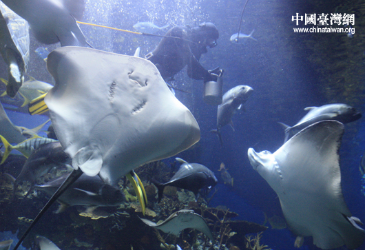 在北京动物园海洋馆的“海底环游厅”里,饲养员正在为“土魟”喂食(中国台湾网 黄艳艳 摄)