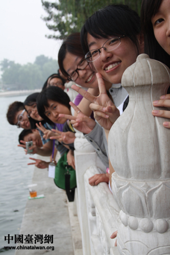 两岸学子在什刹海畔合影留念。(中国台湾网 孟雅诗 摄)