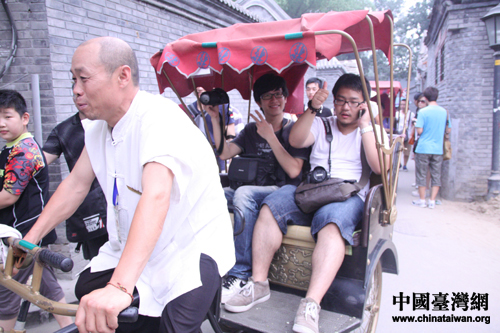 好哥们郑圣谚(左)和莫高泉(右)乘坐黄包车游览北京胡同。(中国台湾网 孟雅诗 摄)