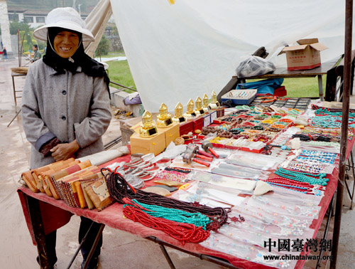 当地居民在塔尔寺门口销售西藏风格小饰品 (中国台湾网 罗旭婷 摄)