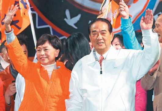今年1月13日台湾地区领导人选举的选前之夜,亲民党候选人宋楚瑜(右)和夫人陈万水(左)同台造势,现场气氛温馨感人;相隔才半年,陈万水却已病逝。(来源:台湾《联合报》)