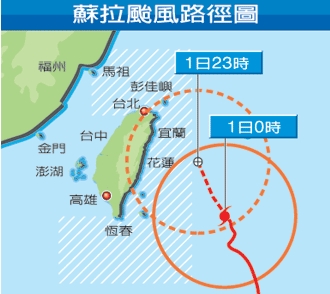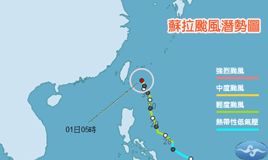 昨晚11时,苏拉的中心位置在鹅銮鼻东方约320公里的海面上,以每小时9公里的速度向北北西行进。气象局第一组防灾科科长谢明昌指出,今天白天宜兰、花莲、新北首当其冲,整天会下400至700毫米;下午开始转吹西北风,桃竹苗和南投山区也将降下超大豪雨。