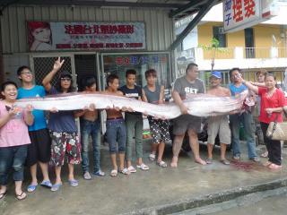 花莲县秀林乡居民扛回长达4米的地震鱼,引来居民围观。图片来自台湾“中央社”