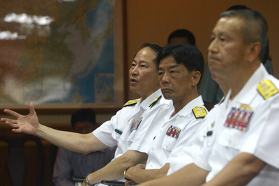 台军海军司令董翔龙上将(左)6日率领相关人员出席记者会,说明台湾168舰队队长张凤强少将逾越操演范围的经过。图片来源:台湾“今日新闻网”