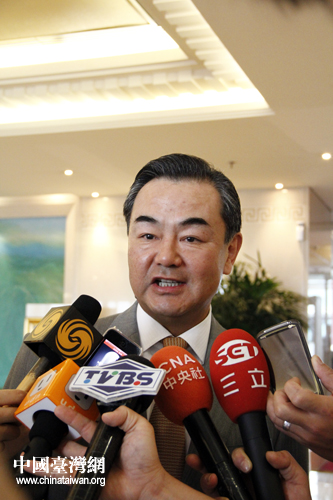 8日上午,中共中央台办、国务院台办主任王毅在首都机场为启程赴台参加两岸两会领导人第八次会谈的海协会会长陈云林送行后接受记者采访。(中国台湾网 杨丽 摄)