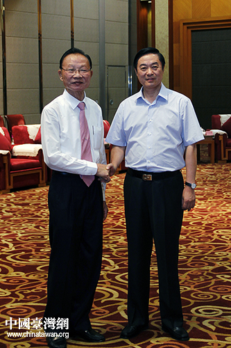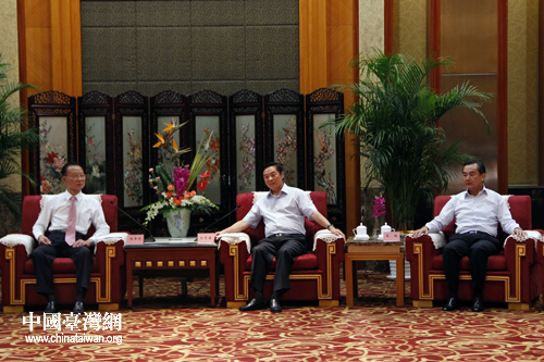 中共四川省委书记刘奇葆,中共中央台办、国务院台办主任王毅,中共四川省委副书记、省长蒋巨峰等,18日下午在成都会见了前来参加第三届两岸县市“双百论坛”的台湾县市民意代表。(中国台湾网 杨丽 摄)