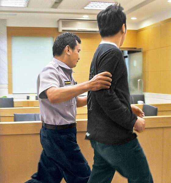 李宗瑞(右)逃亡23天,昨晚向台北地检署投案,在法警陪同下,快跑进入法警室。(图片来自台媒)