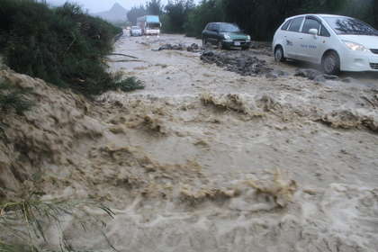 台1线公路枫港段野溪一处路面仅剩一条车道供双向车流沿泥石流通行。(图片来自台媒)