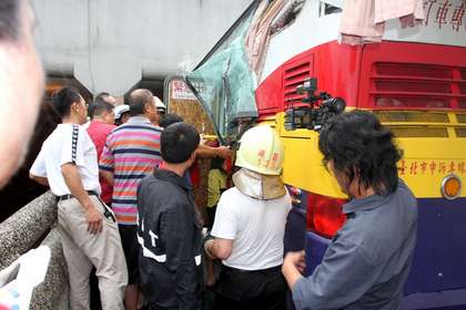 中国台湾网8月24日消息 据台湾媒体报道,一辆满载33人广州陆客游览车,今下午行经台湾嘉义市世贤路(四线道)时,误闯限高2.4米的机车道,车顶撞上路桥损毁,造成28人受伤送医。