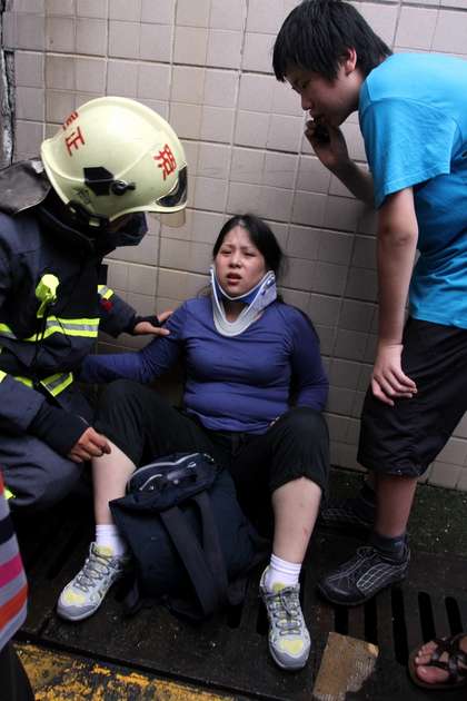 伤者忧虑丈夫和父亲伤势,儿子在一旁安抚。图片来自台媒