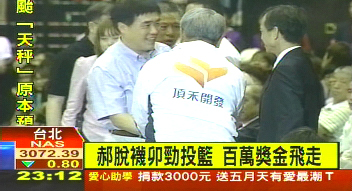 据报道,丰厚奖金摆在那里,要奖励篮球运动,重赏之下有勇夫,迟到的台北市长郝龙斌忍不住也要试身手,那急不可耐的举动连主持人都诧异:“脱鞋子,郝市长为了篮球,第一次在公开场合脱鞋子。”
