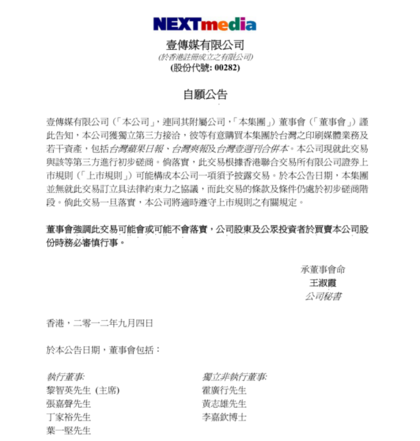 台湾壹传媒有限公司在香港交易所发出自愿公告。来源:台湾媒体