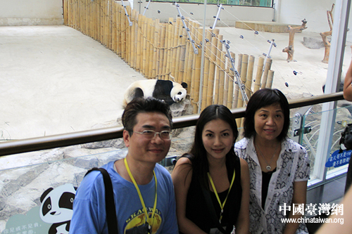在刘公岛海峡两岸交流基地,台商们兴奋地与大熊猫合影。(中国台湾网 杨丽 摄)