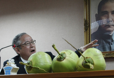 国民党民代林郁方带回太平岛当地的椰子与星沙回到台北召开记者会分享心得。(图片来自台媒)